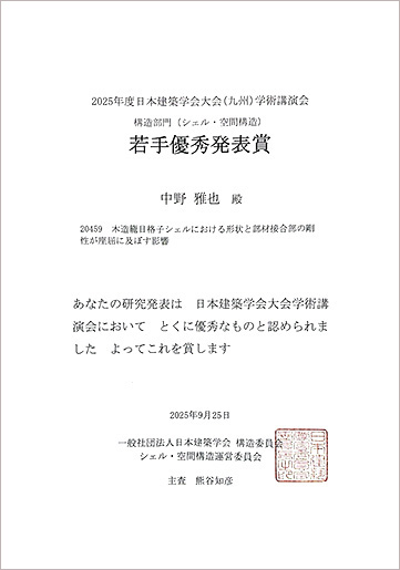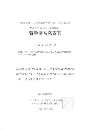 2025年9月に九州大学で開催された2025年度日本建築学会大会(九州)学術講演会において、建築学専攻修士2年の小久保結平さん、中野雅也さん(ともに山下研究室・山下哲郎教授)が構造部門(シェル・空間構造)の若手優秀発表賞を受賞しました。