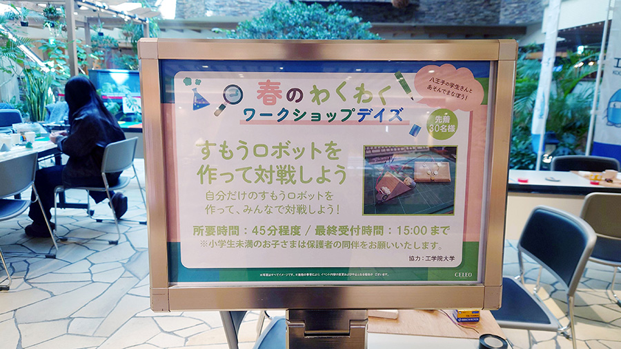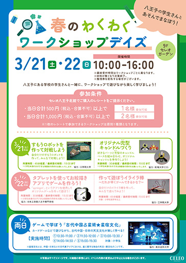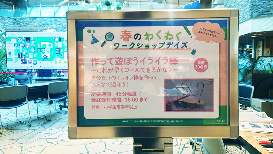 2026年3月21日(土)と22日(日)の2日間、セレオ八王子において「八王子の学生さんとあそんでまなぼう! 春のわくわくワークショップデイズ」(主催:株式会社JR中央線コミュニティデザイン セレオ八王子)が開催され、米盛弘信准教授(電気電子工学科)と学生がモノづくりコーナーを出展しました。