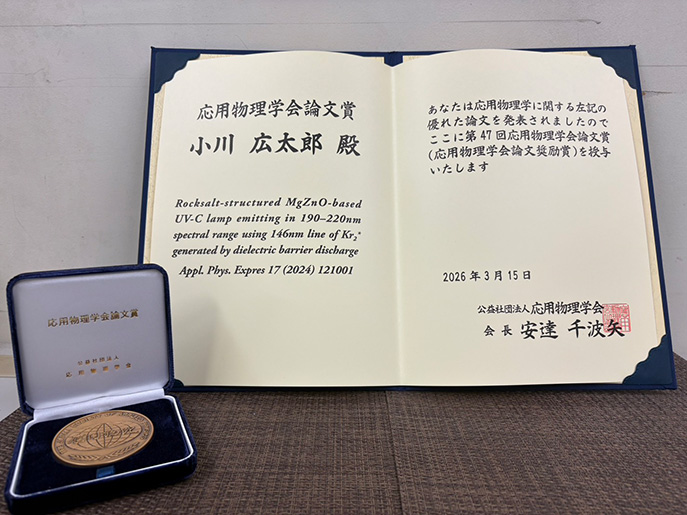2026年3月15日、電気・電子工学専攻 博士後期課程2年の小川広太郎さん(固体物性研究室・尾沼猛儀教授)が第47回応用物理学会論文賞(応用物理学会論文奨励賞)を受賞しました。