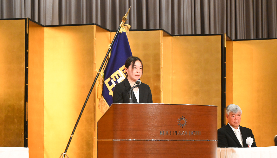 卒業生祝辞では、中西真子さんが学生時代を振り返りながら、大学生活を送る上でのアドバイスとともに新入生へエールを送りました。続く在学生歓迎の辞では、先進工学部環境化学科3年の石井伶奈さん、工学部電気電子工学科3年の今井耀良さんが新入生に向けて歓迎のメッセージを贈り、新入生を迎えました。