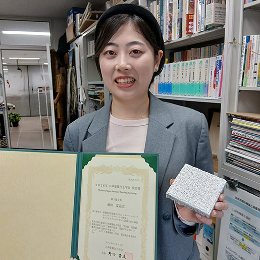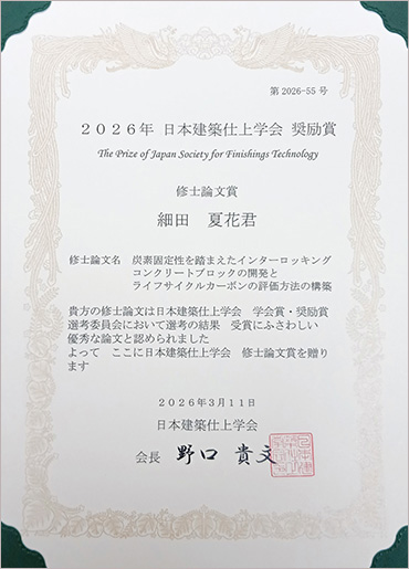 日本建築仕上学会が2025年度の学会賞を発表し、建築学専攻修士2年(受賞当時)の細田夏花さん(田村研究室・田村雅紀教授)が「2025年度日本建築仕上学会奨励賞・修士論文賞」を受賞しました。