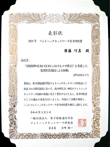 2025年8月に札幌市で開催された「電子情報通信学会フォトニックネットワーク研究会」において、電気・電子工学専攻修士2年の齊藤巧真さん(先進ネットワークシステム研究室・馬場健一教授)が発表した研究成果に対して、フォトニックネットワーク若手研究賞を受賞しました。