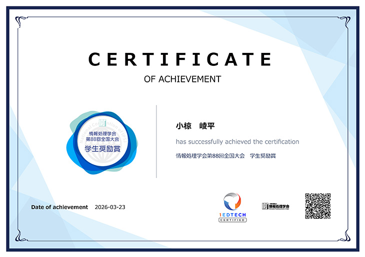 この度は、情報処理学会第88回全国大会におきまして学生奨励賞という名誉ある賞を賜り、誠に光栄に存じます。本研究を進めるにあたり、研究室の皆様より多大なるご指導とご支援を賜りましたこと、心より御礼申し上げます。