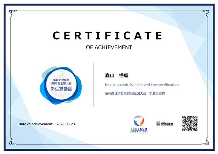 2026年3月6日から8日にかけて松山大学文京キャンパスで開催された「情報処理学会第88回全国大会」において、情報学部システム数理学科4年(受賞当時)の森山悟瑠さん(経営情報システム研究室・三木良雄教授)が、学生奨励賞を受賞しました。