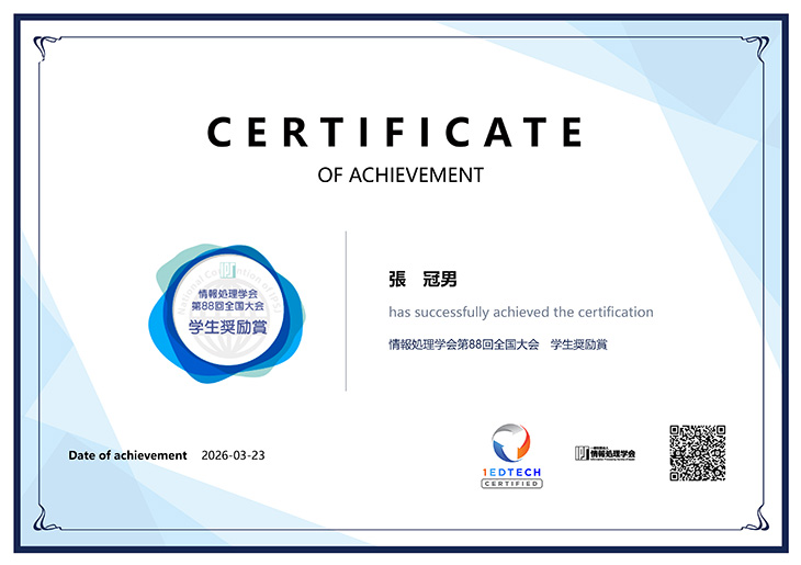 2026年3月6日から8日にかけて松山大学文京キャンパスで開催された「情報処理学会第88回全国大会」において、情報学部 情報通信工学科4年(受賞当時)の張冠男さん(画像情報メディア研究室・陳キュウ教授)が、学生奨励賞を受賞しました。