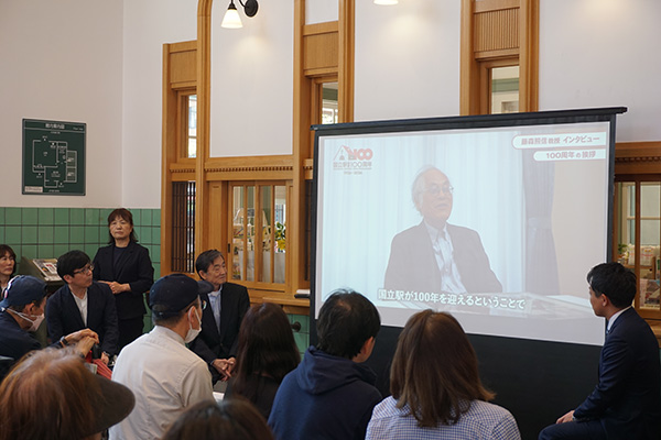 藤森先生はビデオメッセージの中で、旧駅舎が大学通りの桜並木の終着点に位置することの意味や、歴史的建築物として復原された意義に触れ、駅舎はまちの記憶そのものであり、それを残すことが地域のアイデンティティにつながると述べました。