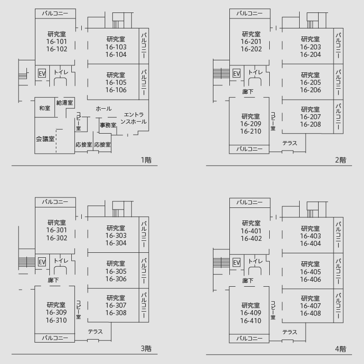 - 仕様・設備等:標準装備=水道・都市ガス・電気(接続工事必要)、空調設備、ネットワーク設備、床(Pタイル)*、天井(メッシュ天井仕上げ)*、 *2~4階の09・10室は、床がOAフロアカーペット、天井が化粧石こうボード仕上げで、コンピュータの利用を中心とした軽実験室。実験冷却水なし。