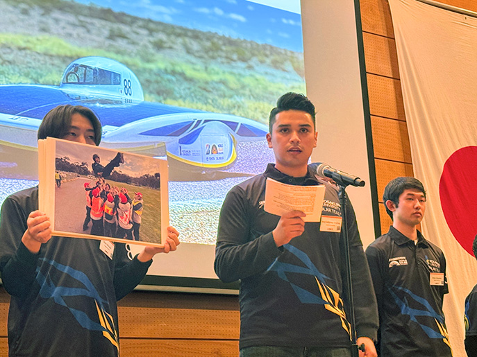 その後の参加大学紹介では、工学院大学がトップで登場。車両輸送、現地での準備、そしてオーストラリア大陸3,000kmの走破まで学生主体で取り組んだプロセスを紹介しました。最後は大会期間中の恒例だった掛け声「チーム、CYGNUS!」を会場に響かせ、雰囲気を盛り上げました。