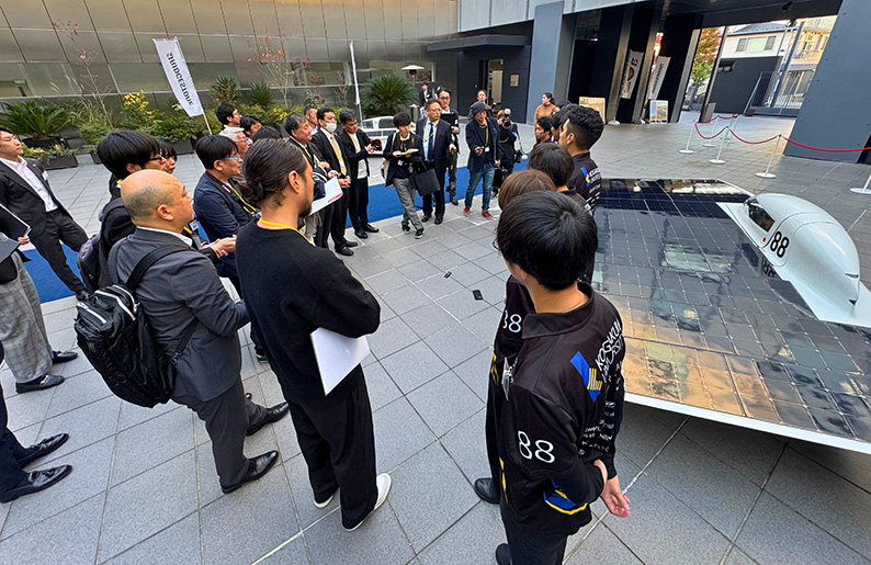 当日は、大会終了後約2か月半をかけ、船便で日本に到着したばかりの車両「CYGNUS」を会場内に展示しました。日本から出場した東海大学、和歌山大学、大阪工業大学の学生たちも参加し、各チームが大会を振り返りながら交流しました。