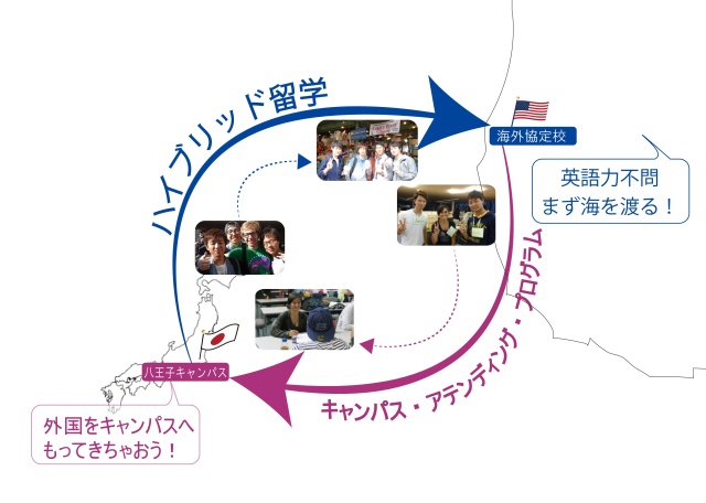 これまでの一般的な国際交流は、留学(海外研修)に「行く」だけ、海外から留学して「来る」だけの「片側交流」でした。本学では、ハイブリッド留学と海外協定校の長・短期日本留学プログラムの受入をリンクさせ、ハイブリッド留学で「行く(留学先の受入大学)」ところの学生が、日本留学プログラムとして工学院大学に「来る」という、「相互交流」を実現しています。